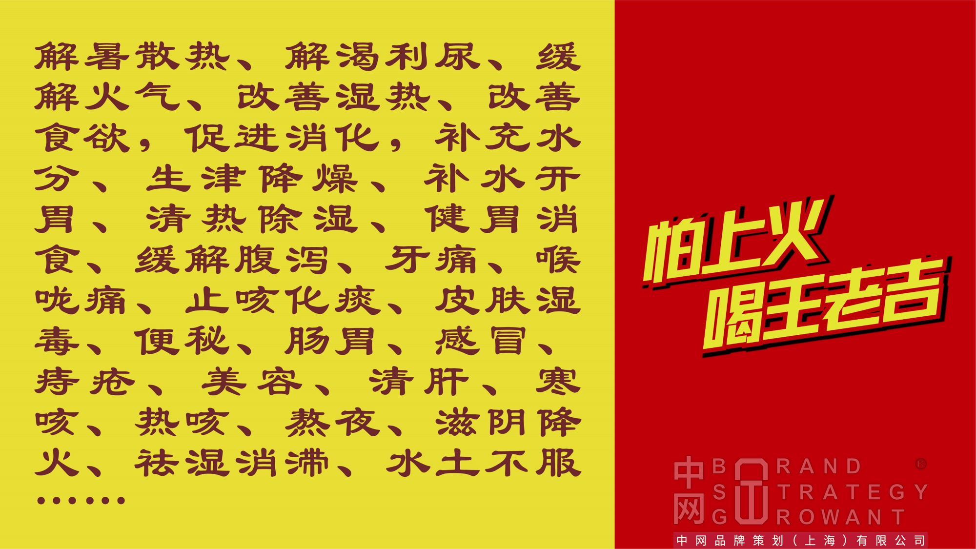 王老吉口号由原来的“健康永恒,永远相伴”换成了“怕上火,喝王老吉”。新口号强调了一个“怕”字。口号达到了一个告知的目的即:上火了,喝王老吉可以消火,它不仅能有效的下火,更能很好的预防上火。新口号,一个“怕”字,既契合了当前社会人们对健康的追求和未雨绸缪的防病心理及健康保健意识,又为后面解决方法(“喝王老吉”)的提出做了铺垫,同时使得语言不那么强硬,消费者更容易接受。王老吉在观察市场和研究消费者方面可谓下足了功夫,在定位上摆脱了“凉茶”的帽子,跳入了“饮料”市场,并在海量的“饮料”市场中开辟出一个新品类——“预防上火的饮料”! 由于“预防上火”是消费者购买红罐王老吉的真实动机,自然有利于巩固加强原有市场。通过二手资料、专家访谈等研究表明,中国几千年的中医概念“清热祛火”在全国广为普及,“上火”的概念也在各地深入人心,这就使红罐王老吉突破了凉茶概念的地域局限。“怕上火,喝王老吉”成为核心诉求,把凉茶的功能删繁就简归纳为“怕上火”,使其通俗化和时尚化。相同的产品,同样的功能,类似的包装,仅仅因为“概念”不同,不仅破解了“凉茶”概念的地域困局,更开创了一个“凉茶”的广阔市场。