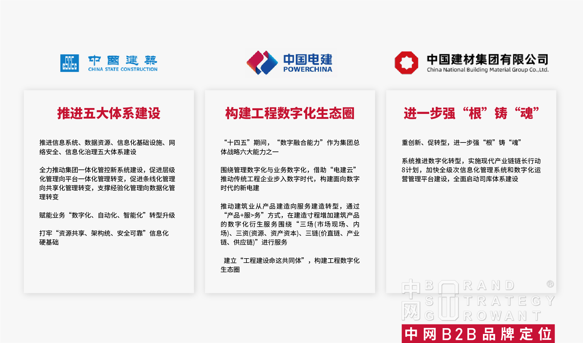 通过和宁波建工的深入沟通,中网发现,简单的品牌形象升级解决不了现有的问题。因为整个行业的发展从高速发展期到相对停滞或缓慢增长的状态,外部业务拓展难,内部管理更难。在宁波建工总部,中网品牌专案组负责人潘攀,面向宁波建工集团党委书记、董事长兼CEO、办公室主任及各部门领导,就中网在B2B品牌领导力建设、B2B品牌定位如何构建长期价值、B2B品牌定位方法论、中网B2B品牌定位案例进行了深入沟通,获得了宁波建工高层的一致认同,确认合作。