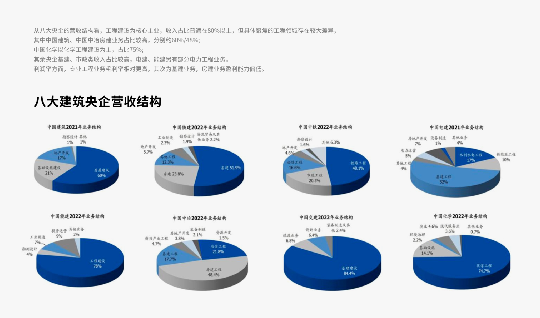 行业受房地产、城投存量债务等因素波及,不断探索新的发展路径:智能建造、BIM技术、绿色建筑、大数据(数据中心)、国企改革、基建工程、轨道交通、装配式建筑、新型城镇化、水利、东数西算(算力)等,从高速增长期进入转型升级期,适者生存的环境下淘汰了一大批企业,促使越来越多的建工企业开始从单纯的建造商转型为建筑服务商。
